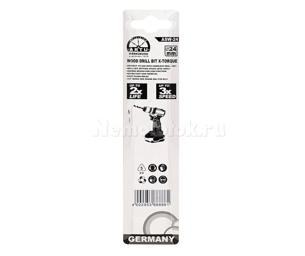 Германия, КитайСверло шнековое (Левиса) по дереву ARTU, 24×160 мм, против заклинивания (ASW-24)