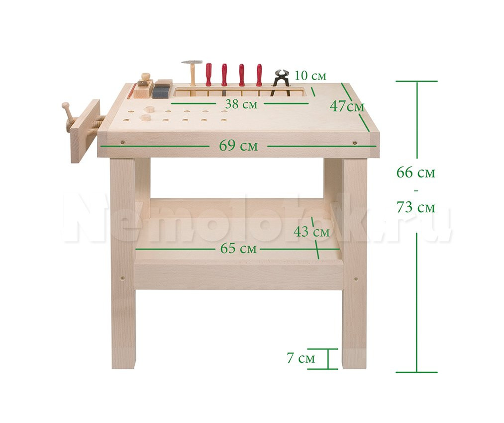Высота верстака регулируется от 66 до 73 см, поэтому он «растёт» вместе с ребёнком и остаётся удобным на протяжении нескольких лет. Просторная рабочая поверхность позволяет комфортно выполнять различные виды работ.